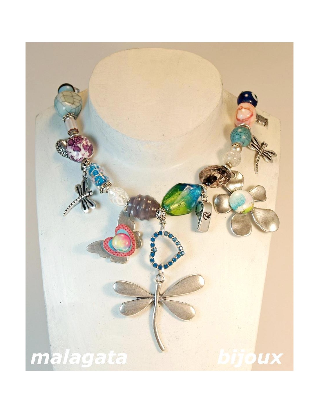 Collar corto realizado con piedras de cristal de diferentes colores y formas.Las piezas plateadas y la cadena son de zamak.La libélula principal mide 4,5 cm de largo x 5,5 cm de ancho,cuelga de un corazón que mide 2 cm y tiene 19 piedritas de swarovski. Mide 53 cm de contorno con cadena final ajustable.