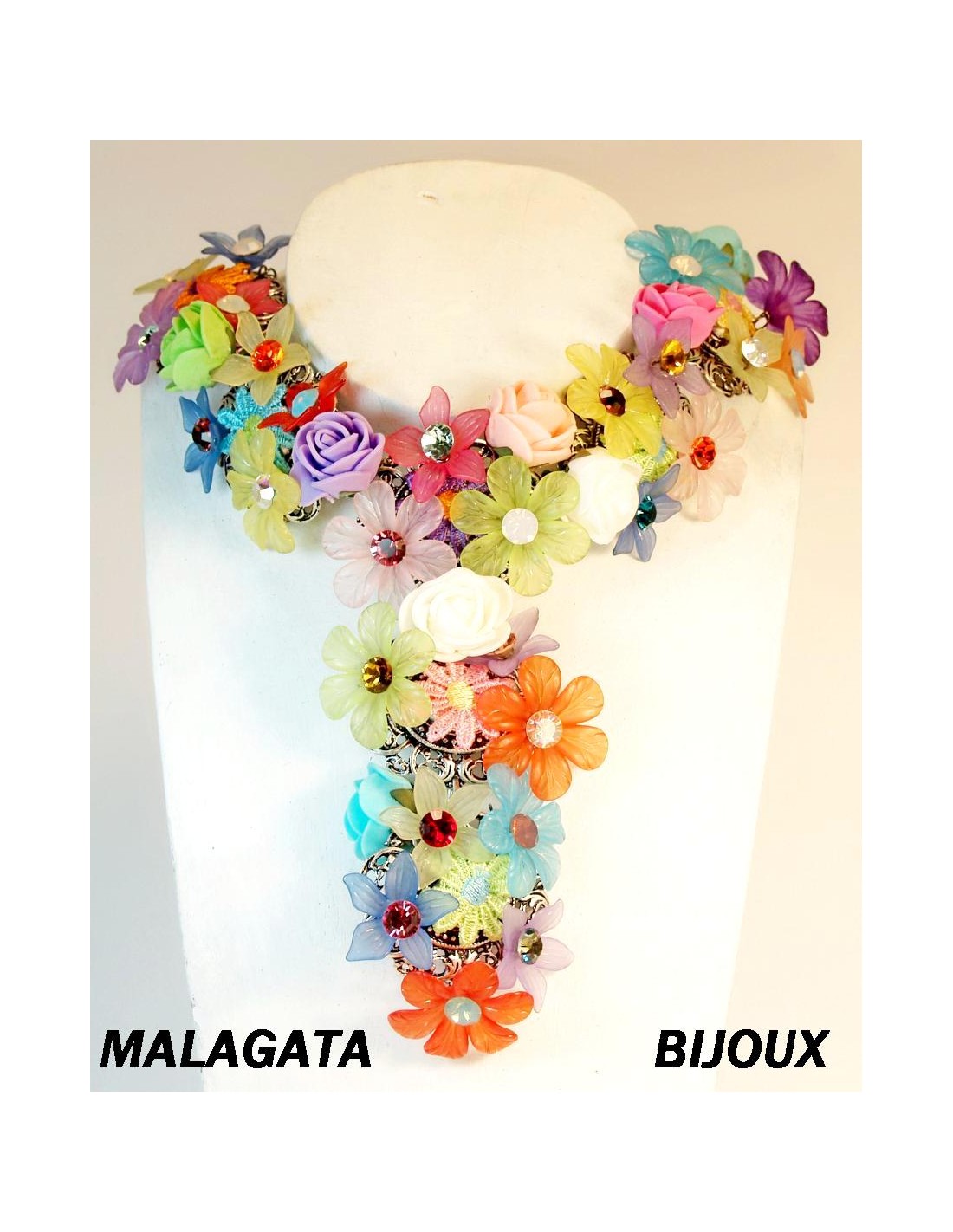 Collar corto en Y,realizado con 7 piezas de zamak de 4,5 cm x 5 cm cubiertas por diferentes flores de gomas,telas y resinas con cristales de swarovski.La pieza central en Y mide 12 cm de largo y 6 cm de ancho aproximadamente.