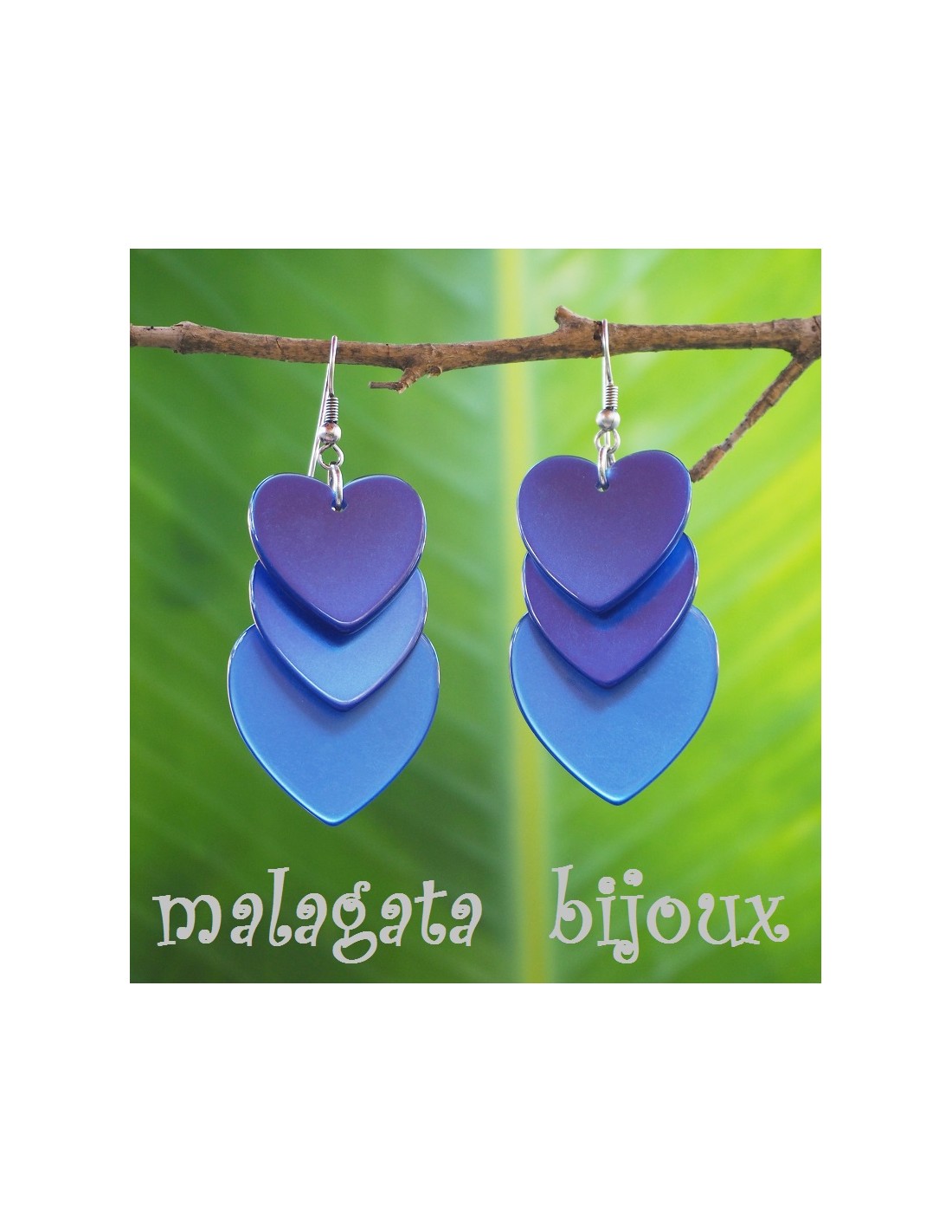 Realizados en resinas azules con cadena y gancho plateado. Miden 3 cm de ancho,los corazones van superpuestos en la cadena alcanzando un largo de 7 cm.